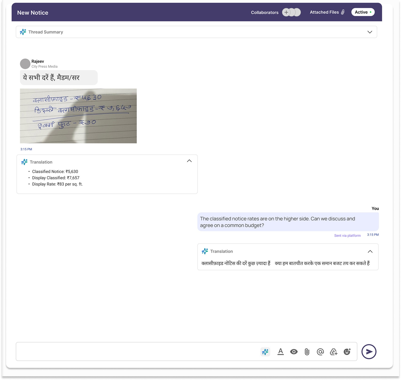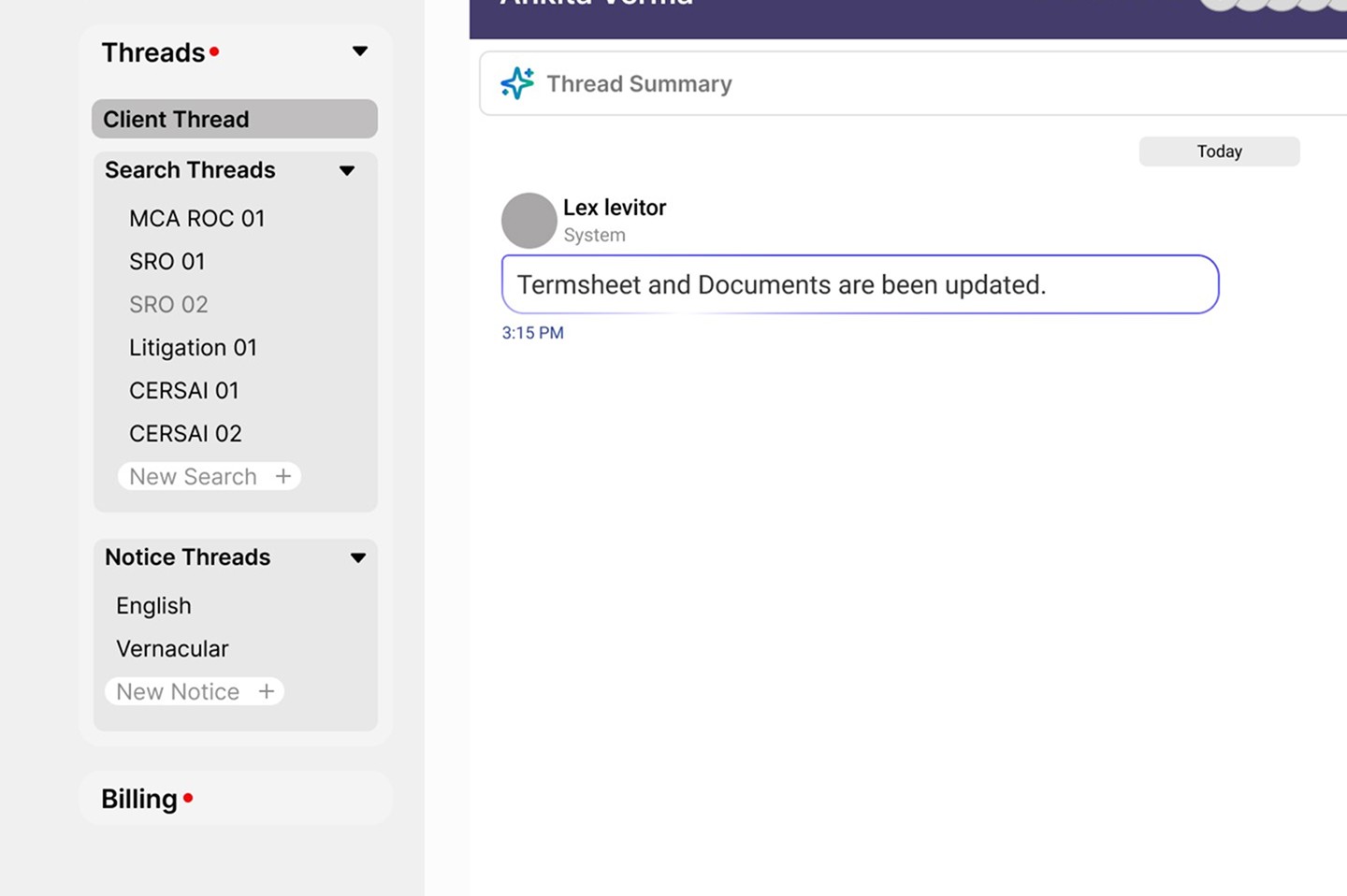 Five decisions defined LexLeviter's direction. A thread-first architecture made client history scannable and contextual. A three-use-case intake model ensured term sheets handled each case type distinctly. An AI Thoughts section brought transparency to every AI-generated output. A vernacular newspaper draft feature auto-generated public notices in regional languages. And a vendor marketplace built directly into the platform eliminated the need for external sourcing calls entirely.