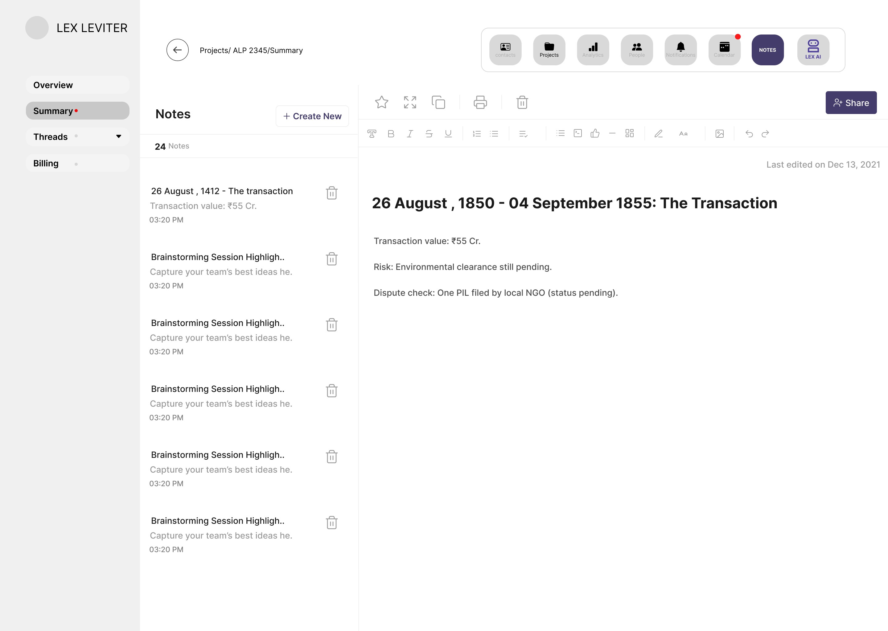 Lex Leviter delivered a platform capable of handling the full legal workflow from signed client to dispatched TSR with zero switching between tools. An embedded AI assistant named Lex made every output explainable and actionable, directly reducing reliance on back-and-forth communication across teams. Every workflow was documented, every AI output was traceable, and the system was competitive enough to ship to market.
